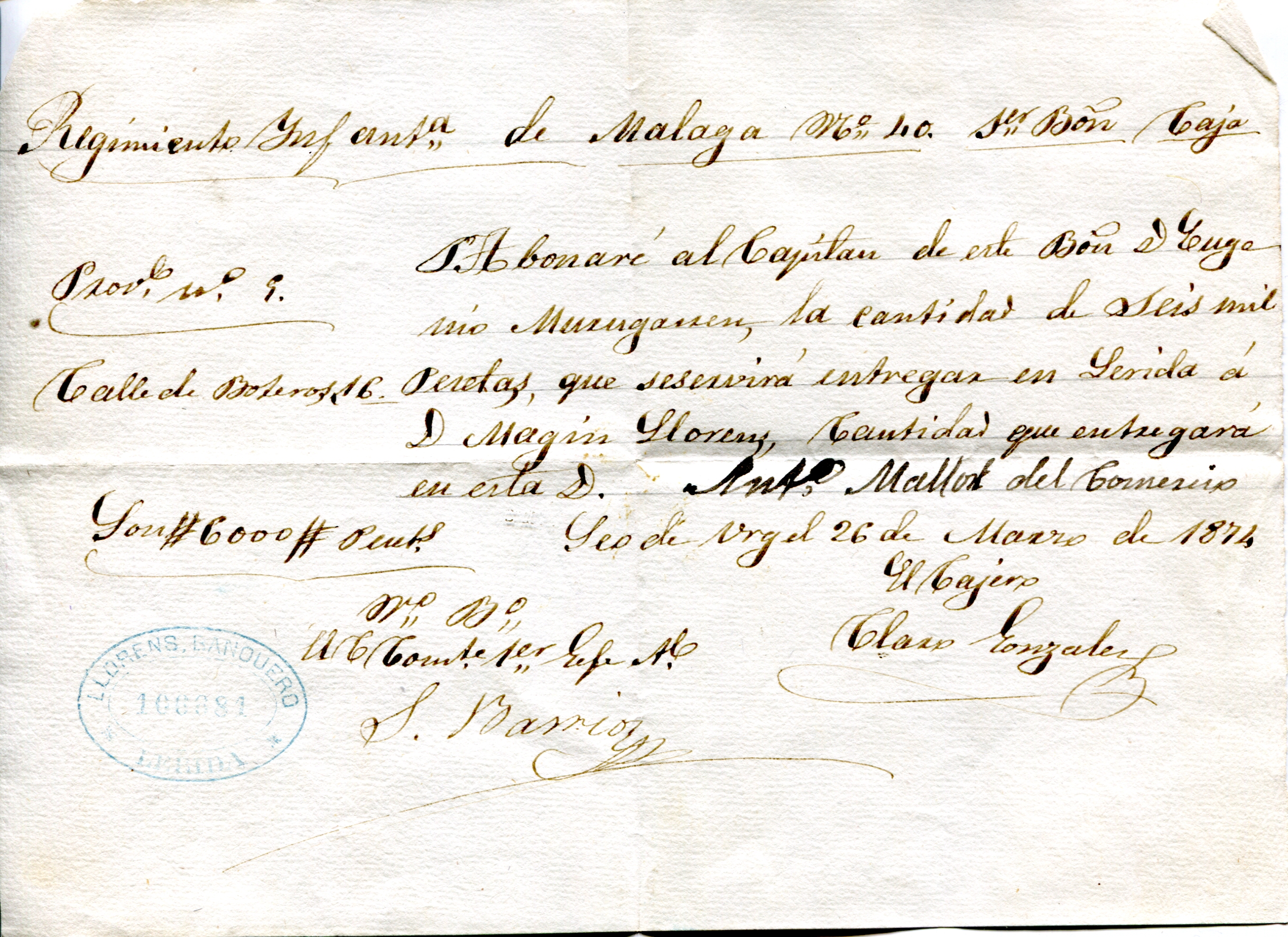 No se quins negocis tenia el meu besavi amb el Rgto. de Infanteria de Malaga nº40. Eren sis mil pesetes, pot ser no tenia res a veure amb la ferreteria, perque, tot i ser andorrà, en l’Acta del Ajuntament de La Seu d’Urgell de 11/9/1874 es nombrat dipositari de “los fondos del municipio”, clar que aixo ho va fer la “Junta de Guerra Carlista”.