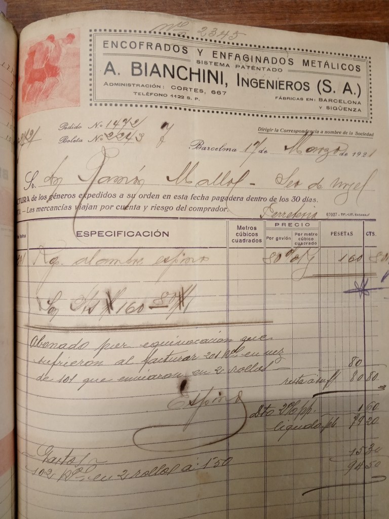ENCOFRADOS Y ENFAGINADOS. A. BIANCHINI, INGENIEROS (S.A.) 5 Octubre, 2021 per santiagomallol, posted in factures De 1921. En la pagina web actual d’aquesta fabrica ja ho diu més de 100 anys………. Compártelo: Feu clic per compartir a X (S'obre en una nova finestra) X Feu clic per compartir al Facebook (S'obre en una nova finestra) Facebook M'agrada S'està carregant... Relacionats