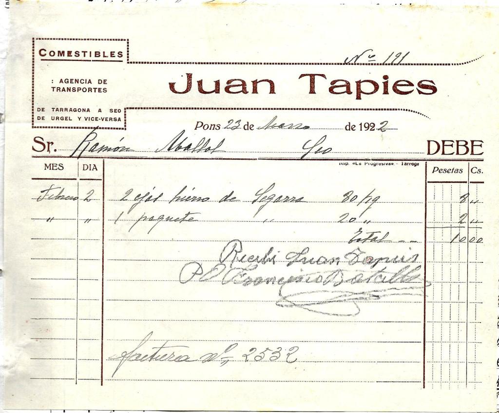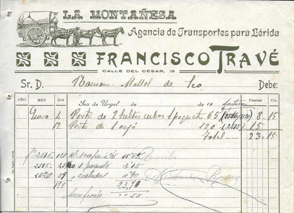 ELS TRANSPORTISTES. 1922 14 Juny, 2022 per santiagomallol, posted in factures Aprofitant que aquestes factures fan cent anys, podeu comprobar els antecedents locals de les agencies de transport. Compártelo: Feu clic per compartir a X (S'obre en una nova finestra) X Feu clic per compartir al Facebook (S'obre en una nova finestra) Facebook M'agrada S'està carregant... Relacionats