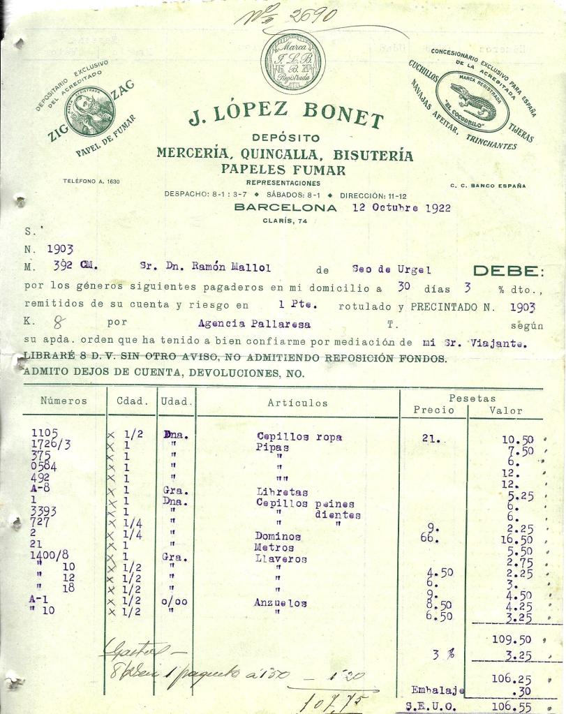 J. LÓPEZ BONET. 1922 2 Agost, 2022 per santiagomallol, posted in factures Merceria, quincalla, bisuteria , papeles de fumar………. ,.En els llibres apareix com a proveïdor des de 1910 fins a 1923. Compártelo: Feu clic per compartir a X (S'obre en una nova finestra) X Feu clic per compartir al Facebook (S'obre en una nova finestra) Facebook M'agrada S'està carregant... Relacionats