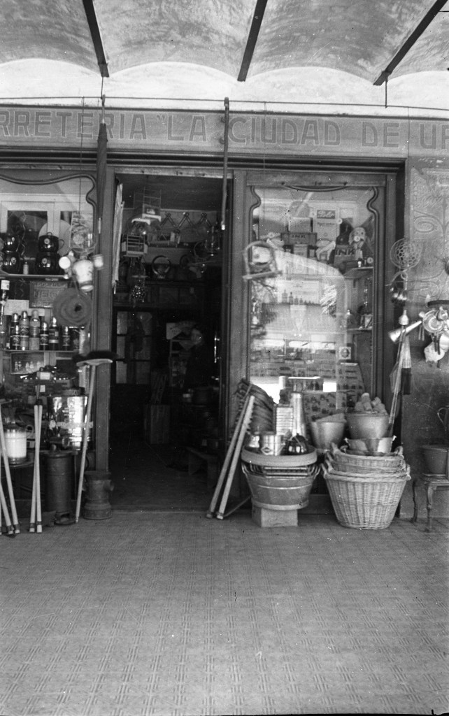 Del arxiu fotogràfic familiar ha sortit aquesta foto ( no gaire bona), de la porta de la ferreteria. Crec que pot ser de any 1932 . Les mercaderies desbordaven el local.