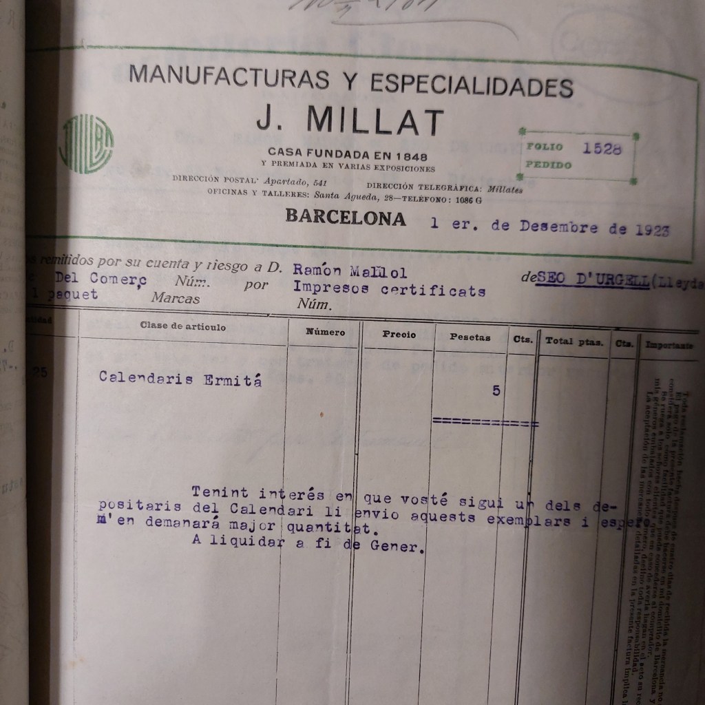 De les factures del 1923. aquesta dels calendaris de l’ERMITÁ. Els accents oberts no eren norma encara. Les factures d’ aquests anys estan relligades amb uns arxivadors de difícil desmuntatge ,perdoneu la mala qualitat de la foto.