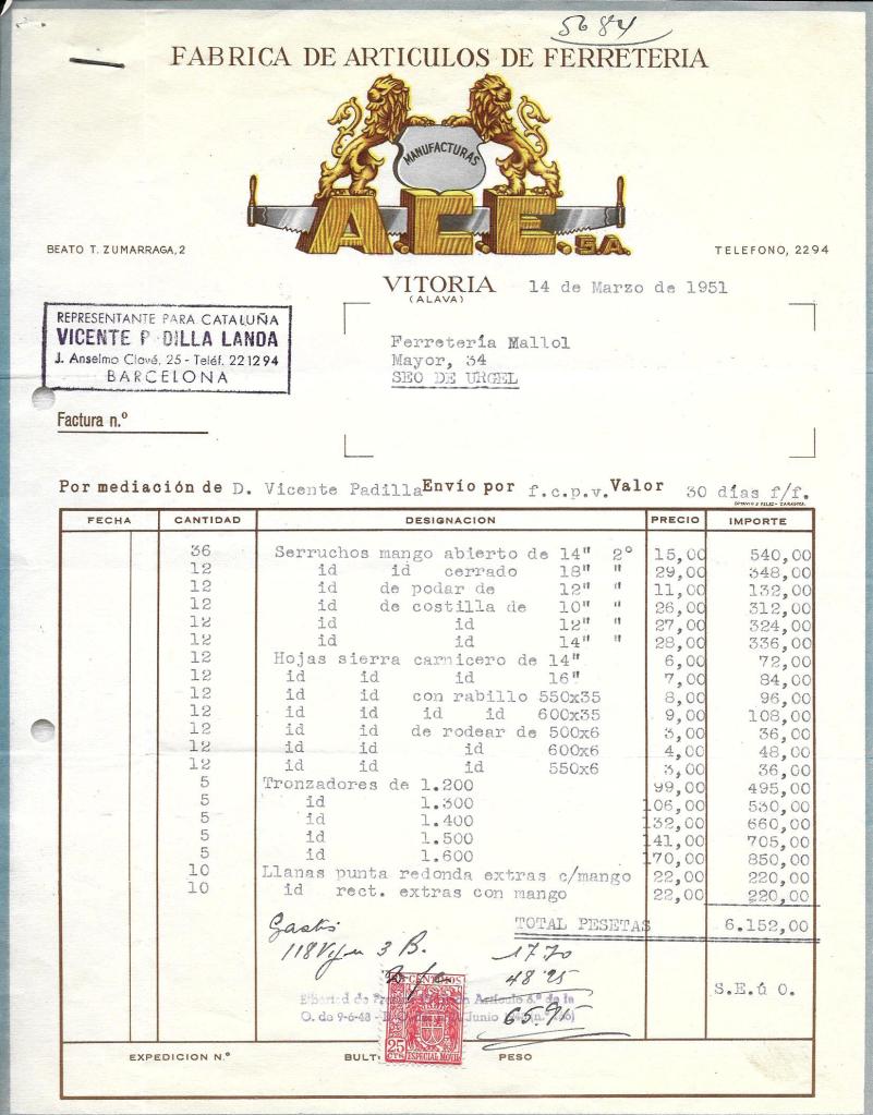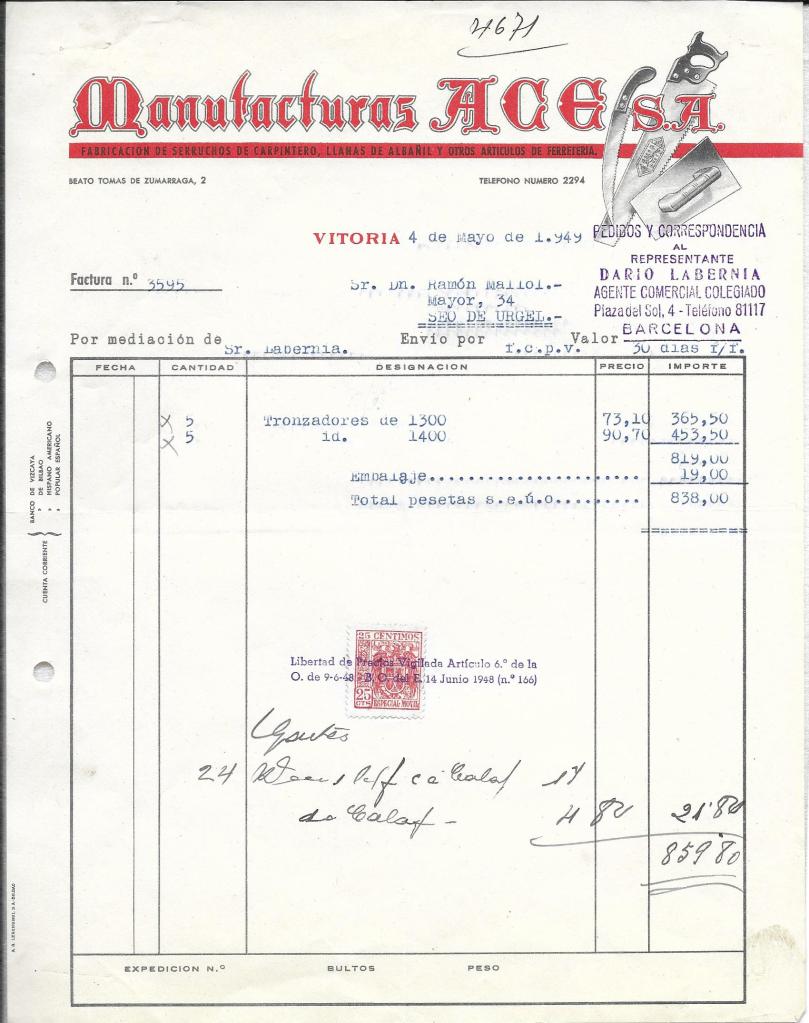 MANUFACTURAS ACES.A. 1949.1951 14 Març, 2023 per santiagomallol, posted in factures “Libertad de Precios Vigilada”, Curiositats de la dictadura. Compártelo: Feu clic per compartir a X (S'obre en una nova finestra) X Feu clic per compartir al Facebook (S'obre en una nova finestra) Facebook M'agrada S'està carregant... Relacionats