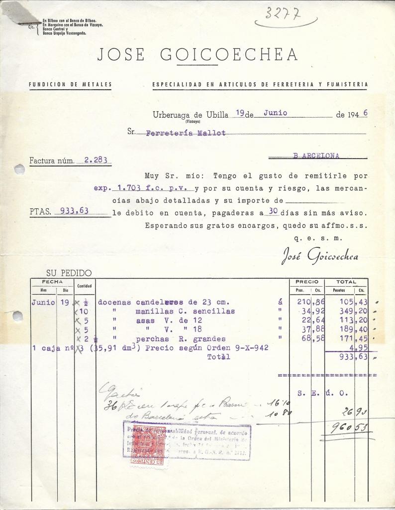 Fabrica a URBERUAGA DE UBILLA. La tarifa no porta data , pero el Sr. José ha passat a Goicochea e Hijo, S.R.C., penso que encara existeix la firma.