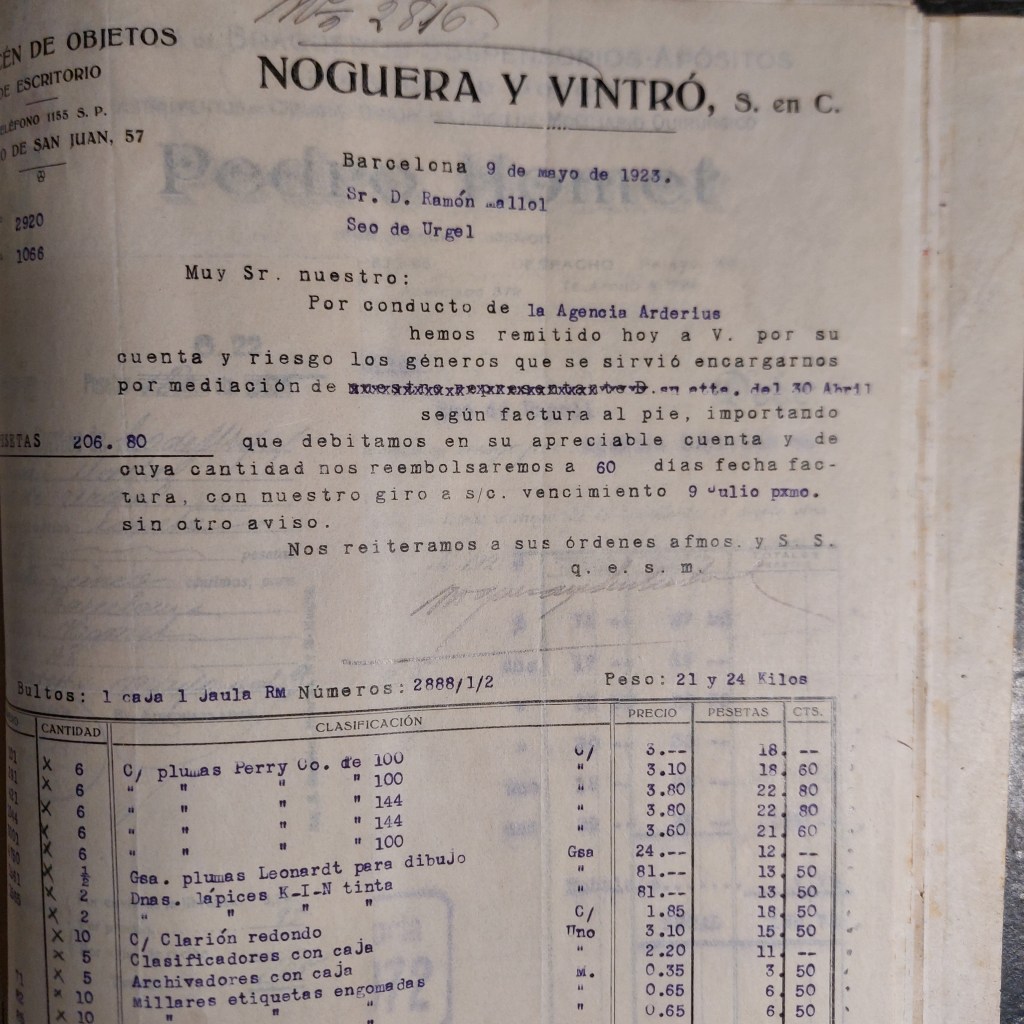 De les factures del 1923. aquesta dels calendaris de l’ERMITÁ. Els accents oberts no eren norma encara. Les factures d’ aquests anys estan relligades amb uns arxivadors de difícil desmuntatge ,perdoneu la mala qualitat de la foto.