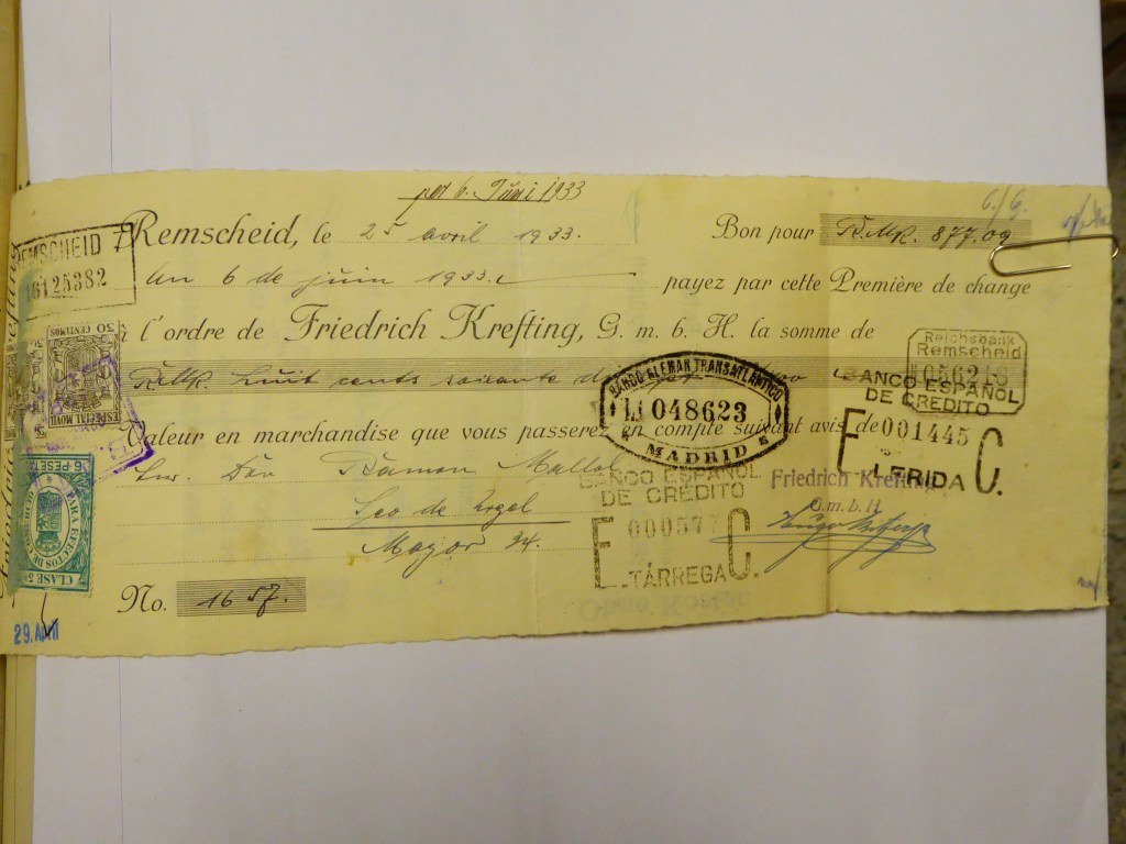 Diu la factura: “Herramientas de calidad finísima ….” enviades des de Alemanya a traves del Sr. Borràs Cort, “Agente de fabricas”, ara en diríem viatjant de comerç. La lletra de canvi, un altra curiositat per les noves generacions, es a dir el rebut de pagament va passant per successius bancs fins arribar a La Seu d’Urgell. A l’ any 1933 el mercat europeu ja hi era, però els pagaments eren complicats.